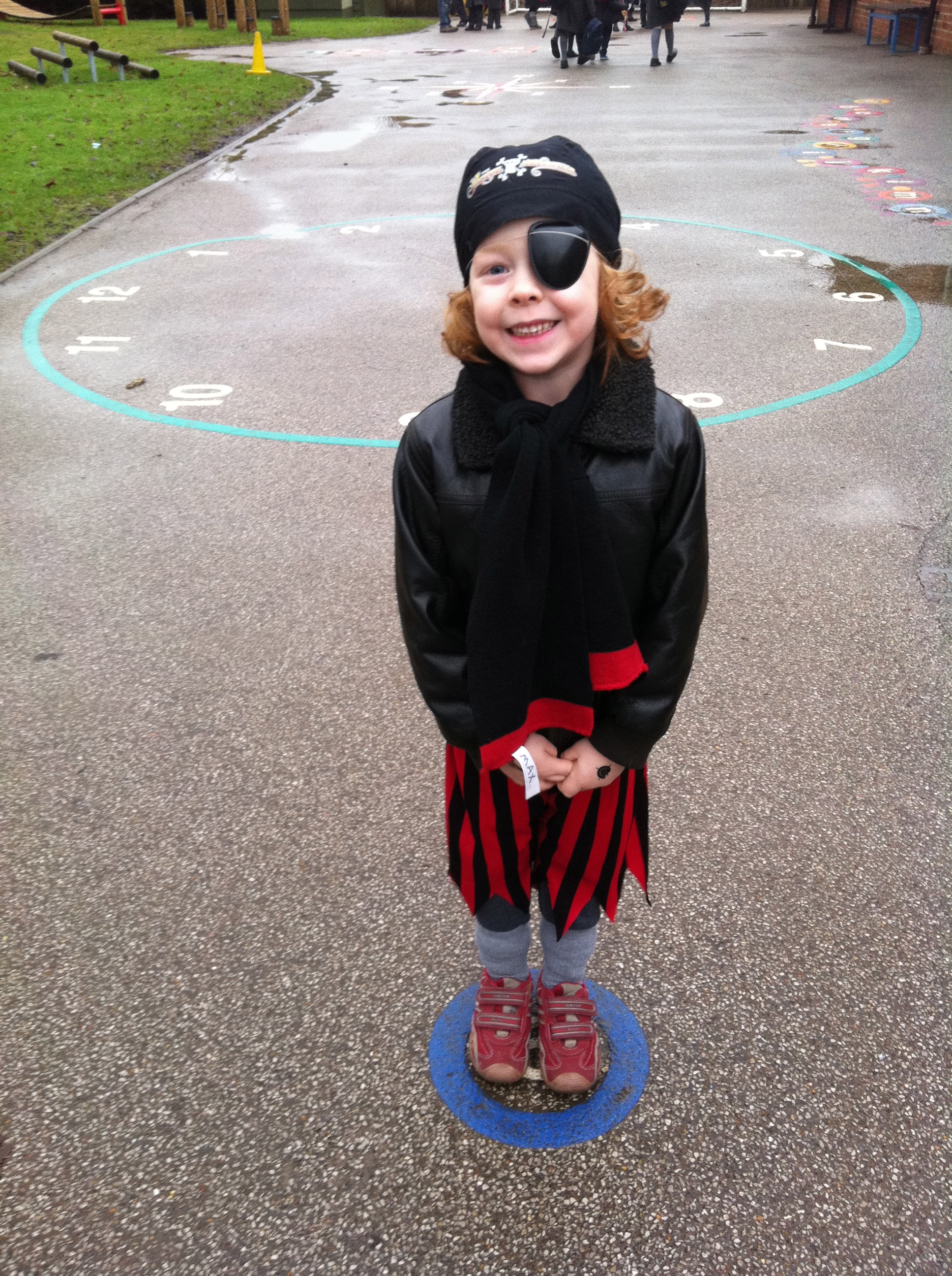 Anyway, back to the point. Curly Headed Boy suddenly got very excited about this. ‘So that means that Ganny smiled a lot, and the wind caught her, and now she always looks cheerful?’ (Ganny = Granny). I won’t mention what he thought big hairy northern hubby must do a lot, but just lets say he might need some botox soon ;o) Since then he has been repeatedly smiling at the wind, or asking if it’s going to be windy today, bless him. Here is an example of a Pirate smile for you (today is Pirate Day at school)!