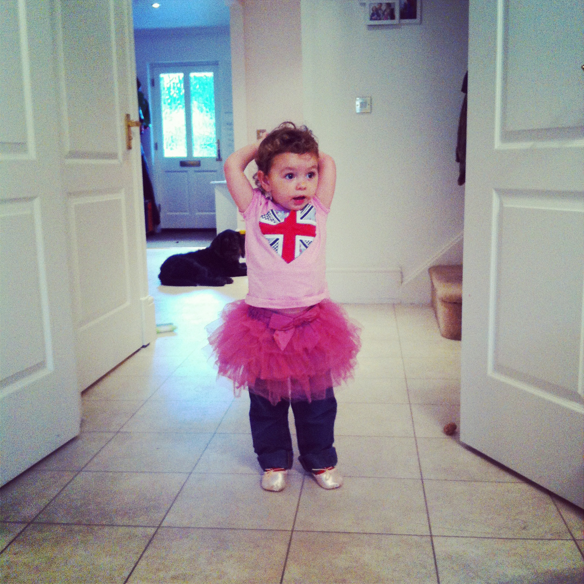 Finally, little ballet shoes bought by her still guilty feeling Dad did the trick yesterday to get her pirouetting around the kitchen (and thus lifting her arm above her head).