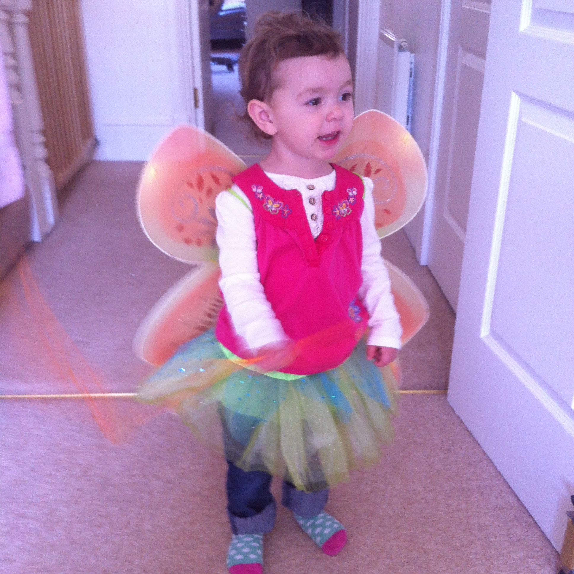 I was moaning that Next had let me down and there were no tutu’s this year when the Fairy Glass guys (the guys who I bought the pink wings from at Just So) offered to send her some new wings and tutu for this year (the blurring is her waving her matching wand – see it’s proper magic!):